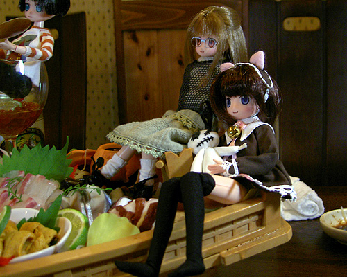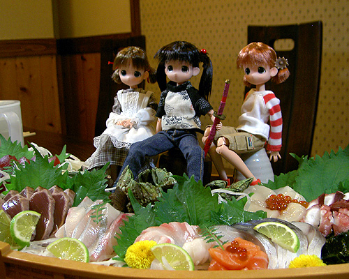 さて、先頃執り行われました浜松オフ会の模様をレポしたいと思います!! とあるお料理やさんを貸し切り状態にさせていただきまして、板長…違いました、 痛長さんに料理の腕をふるっていただきましたよ! 何がすごかったって、痛盛り ですよ! 痛盛り!! 具体的に言いますと、「ちっちゃなもこちゃん」と刺身舟盛りのコラボという では、 れっつくっきーん!! 慎重に盛りつける痛長さん… 膝の角度とか手の位置とか妥協はありません! なんか「日本刀もってきて!」とかありえない指示が飛んでたりします!! ![]() 出航! おそらく日本で始めてではないか、と仰っておられました。 まぁ…そりゃ… ![]() ご紹介します。真ん中が長女様、日本刀が似合います。両側が双子ズ。 刺身もなにげに豪華でありますよ! ![]() はしっこには甲斐甲斐しくワサビ皿を持つ子たちも! ![]() たちまち群がる男共(オタク)の群れ! 順番待ちです!! 光量が足りないと照明まで持ち出してきました! えと…飲み会…ですよね… ![]() 「下からの光が足りない!レフ皿!!」 痛長の指示が飛びます! …レフ皿? ![]() 「くるしゅうない」 ![]() そして第2弾! ハロウィンも近いとありまして… ![]() ひらめき!きらめき! 痛ハロウィン船盛り!!!!!! ![]() キュートでかわいいです! って、見えてますよ!ぱんつ!! ![]() お刺身もドールもてんこ盛りです! ![]() 極一部で大人気なボクっ子。体を張っています! ![]() 服もハロウィンっぽくなっているそうですよー ![]() 撮影に超真剣な表情の痛長。まわりはカメラだらけであります! ![]() …で、おいしくいただきました。 ![]() ちなみに… 前回のではありますが、こういうお酒が並ぶオフ会であります。 ![]() おまけ、デザート。 ![]() この他にもお料理盛りだくさんで大変楽しいオフ会でした! 痛長さん誠にありがとうございました! 痛長さんも仰ってましたが… このお店、秋葉原に支店出したら大繁盛間違いなしっ! にゃ〜このご主人、マジで出資しますよー! |